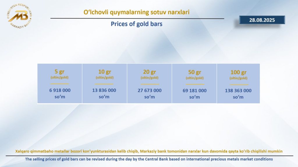 Markaziy bank 14-avgust holatiga ko‘ra, oltin o‘lchov quymalari narxini ham yangiladi: ma’lumotlarga ko‘ra, O‘zbekiston Markaziy bankining 1 gramm oltini 1 383 630 so‘mni tashkil etadi. Quyida o‘lchovli quymalarning kotirovkalari keltirilgan: