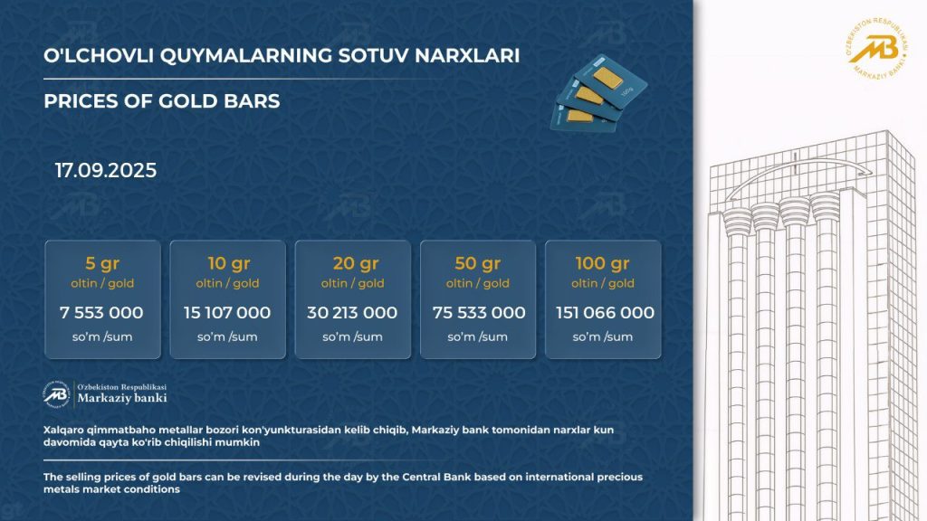 Markaziy bank 17-sentyabr uchun oltin o‘lchov quymalari narxini ham yangiladi: ma’lumotlarga ko‘ra, O‘zbekiston Markaziy bankining 1 gramm oltini 1 510 660 so‘mni tashkil etadi. Quyida o‘lchovli quymalarning kotirovkalari keltirilgan: