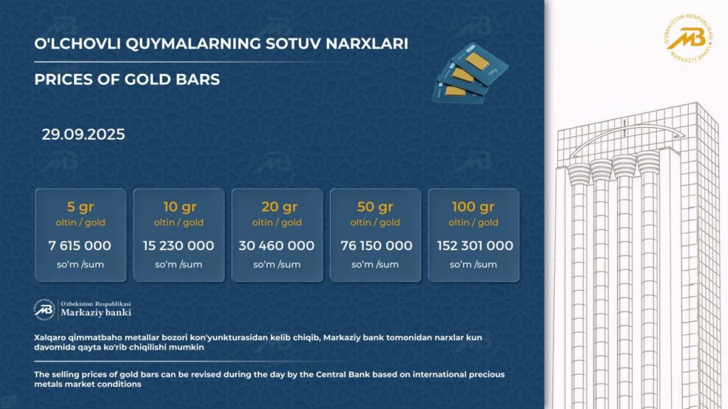 Shuningdek, Markaziy bank 29-sentyabr uchun oltin o‘lchov quymalari narxini yangiladi: ma’lumotlarga ko‘ra, O‘zbekiston Markaziy bankining 1 gramm oltini 1 523 010 so‘mni tashkil etadi. Quyida o‘lchovli quymalarning kotirovkalari keltirilgan: