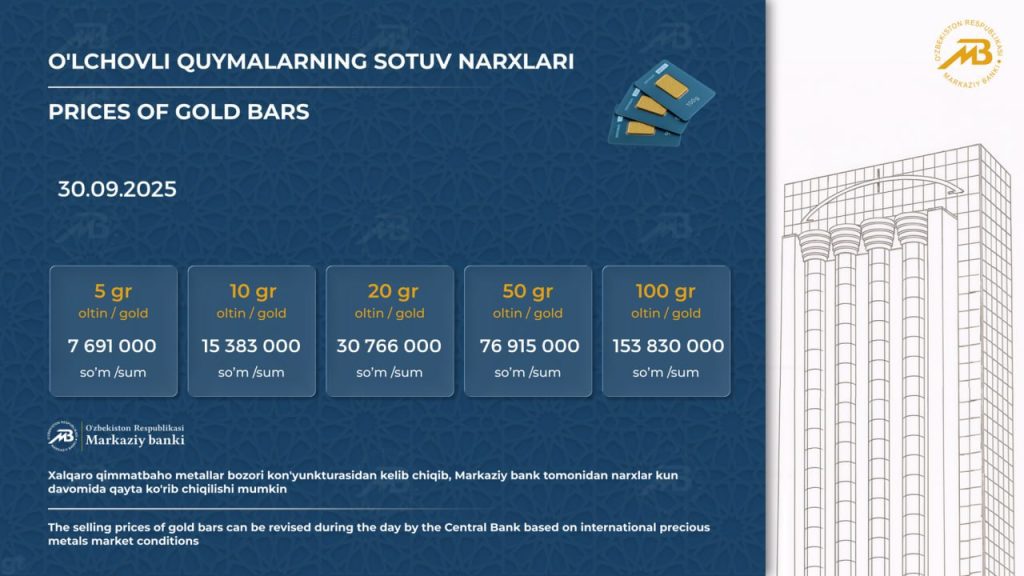 Shuningdek, Markaziy bank 30-sentyabr uchun oltin o‘lchov quymalari narxini yangiladi: ma’lumotlarga ko‘ra, O‘zbekiston Markaziy bankining 1 gramm oltini 1 538 300 so‘mni tashkil etadi. Quyida o‘lchovli quymalarning kotirovkalari keltirilgan: