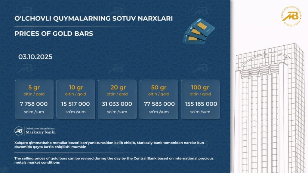 Shuningdek, Markaziy bank 3-oktyabr uchun oltin o‘lchov quymalari narxini yangiladi: ma’lumotlarga ko‘ra, O‘zbekiston Markaziy bankining 1 gramm oltini 1 551 650 so‘mni tashkil etadi. Quyida o‘lchovli quymalarning kotirovkalari keltirilgan: