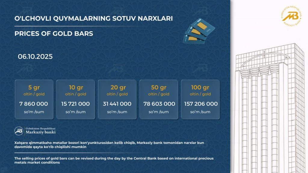 Shuningdek, Markaziy bank 6-oktyabr uchun oltin o‘lchov quymalari narxini yangiladi: ma’lumotlarga ko‘ra, O‘zbekiston Markaziy bankining 1 gramm oltini 1 572 060 so‘mni tashkil etadi. Quyida o‘lchovli quymalarning kotirovkalari keltirilgan: