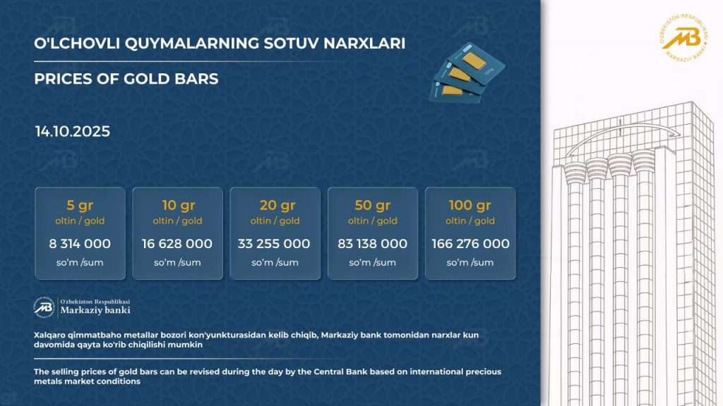 Shuningdek, Markaziy bank 10-oktyabr uchun oltin o‘lchov quymalari narxini yangiladi: ma’lumotlarga ko‘ra, O‘zbekiston Markaziy bankining 1 gramm oltini 1 620 680 so‘mni tashkil etadi. Quyida o‘lchovli quymalarning kotirovkalari keltirilgan: