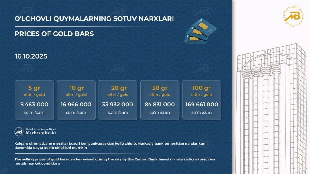 Markaziy bank 16-oktyabr uchun oltin o‘lchov quymalari narxini ham yangiladi: ma’lumotlarga ko‘ra, O‘zbekiston Markaziy bankining 1 gramm oltini 1 696 610 so‘mni tashkil etadi. Quyida o‘lchovli quymalarning kotirovkalari keltirilgan: