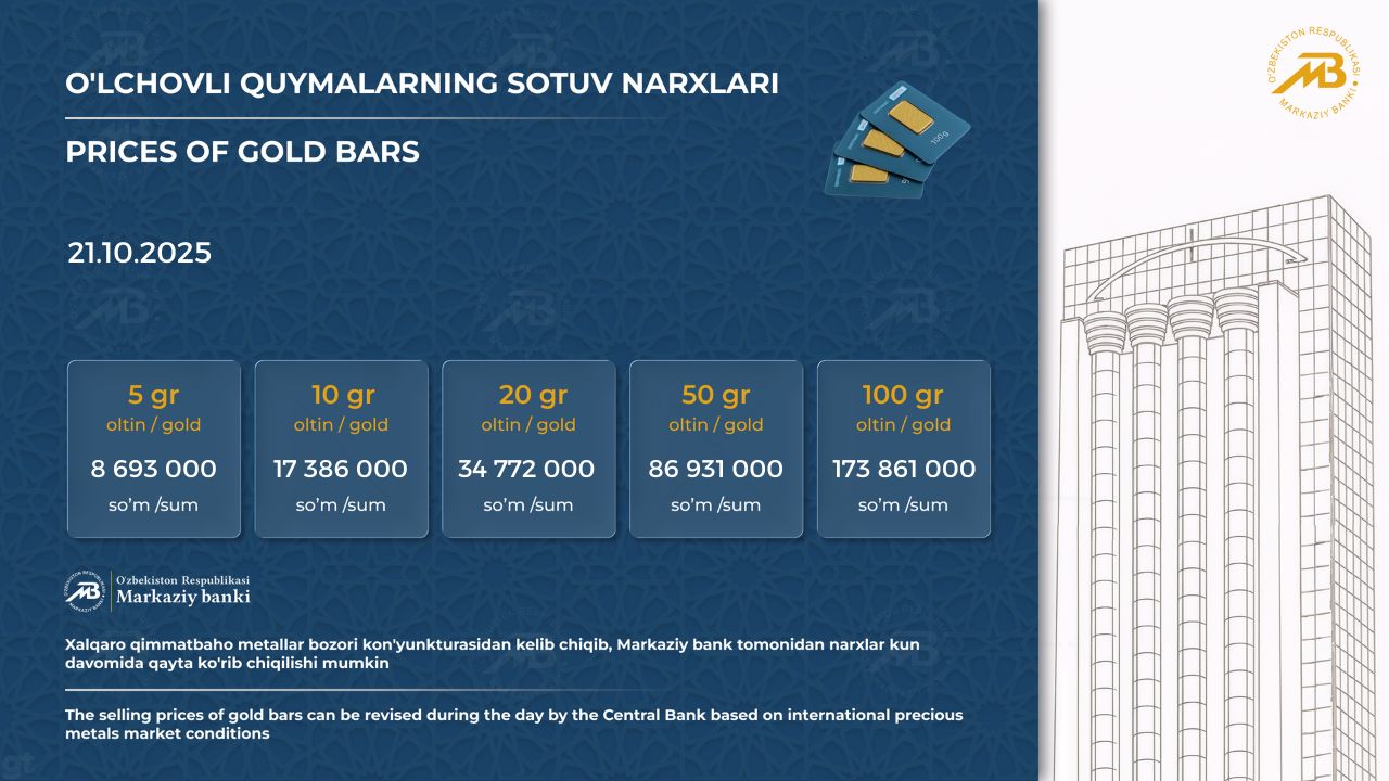 Markaziy bank 21-oktyabr uchun oltin o‘lchov quymalari narxini ham yangiladi: ma’lumotlarga ko‘ra, O‘zbekiston Markaziy bankining 1 gramm oltini 1 738 610 so‘mni tashkil etadi. Quyida o‘lchovli quymalarning kotirovkalari keltirilgan: