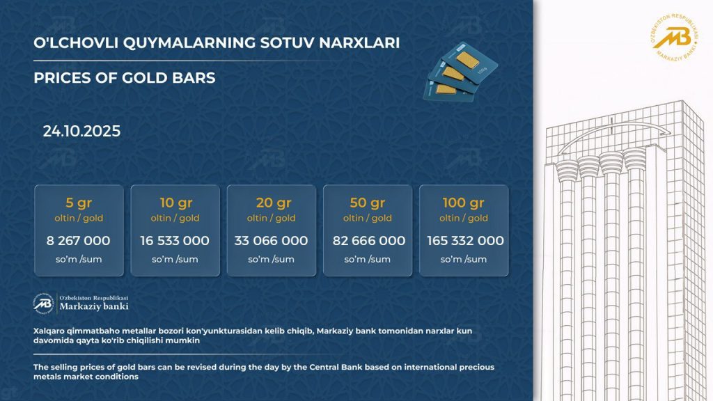 Shuningdek, Markaziy bank 24-oktyabr uchun oltin o‘lchov quymalari narxini yangiladi: ma’lumotlarga ko‘ra, O‘zbekiston Markaziy bankining 1 gramm oltini 1 653 320 so‘mni tashkil etadi. Quyida o‘lchovli quymalarning kotirovkalari keltirilgan: