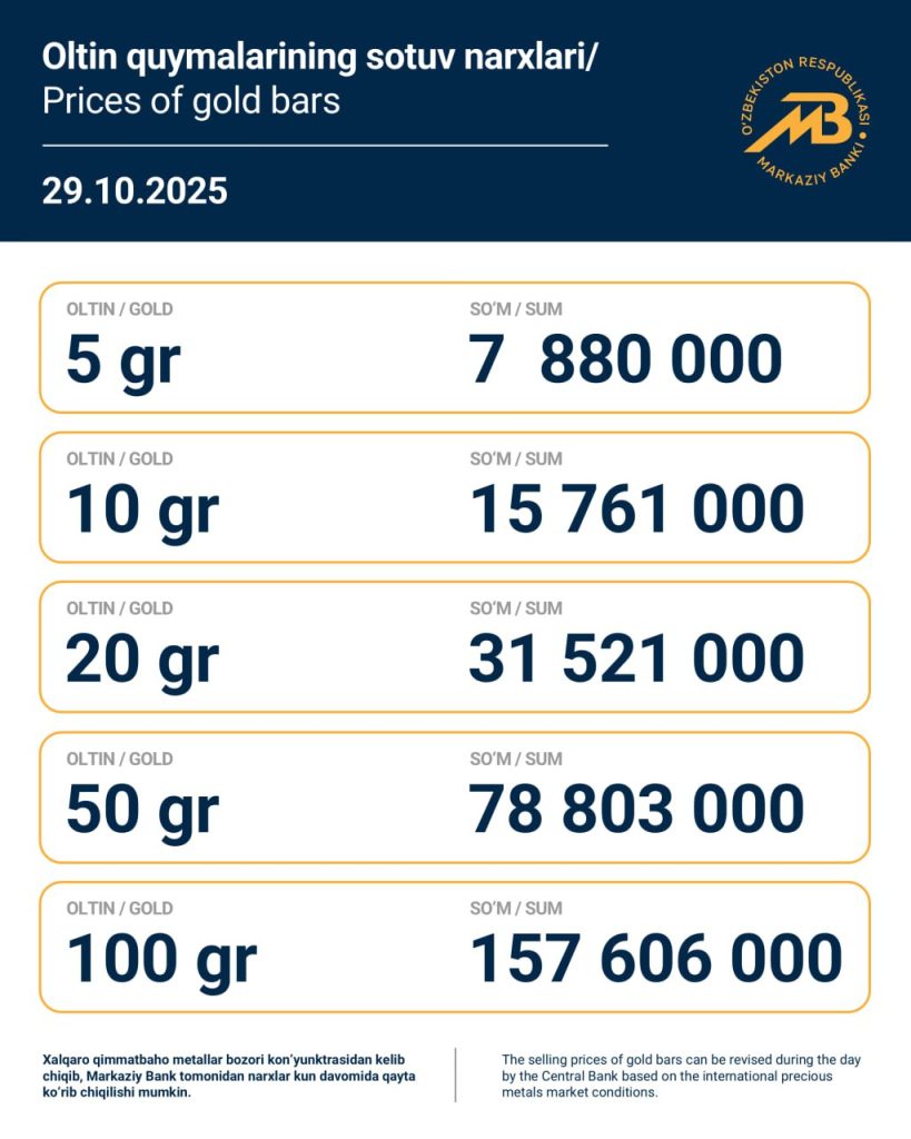 Shuningdek, Markaziy bank 29-oktyabr uchun oltin o‘lchov quymalari narxini yangiladi: ma’lumotlarga ko‘ra, O‘zbekiston Markaziy bankining 1 gramm oltini 1 576 060 so‘mni tashkil etadi. Quyida o‘lchovli quymalarning kotirovkalari keltirilgan: