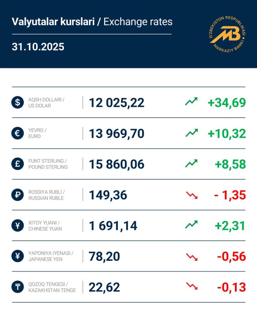 Regulyator ma’lumotlariga ko‘ra, rubl, iyena va tenge kursi pasaygan, qolgan barcha valyutalar qimmatlashgan. 31-oktyabrdagi asosiy kurslar quyidagicha bo‘ladi: