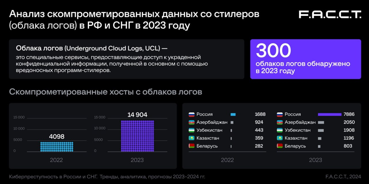 — 2023 йилда Россия ва МДҲдаги йирик банкларга тегишли бузилган ҳисоб рақамлари 496 тадан 2282 тагача беш бараварга ошган. Ушбу ёзувларнинг манбаи булут журналларидан (UCL) олинган маълумотлар эди.