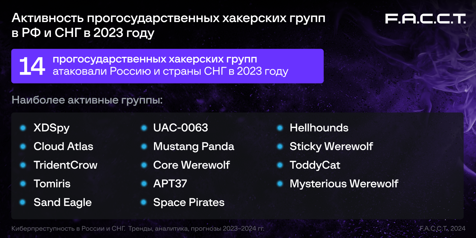 — F.A.С.С.T. мутахассислари Threat Intelligence 2023 йилда Россия ва МДҲ давлатларида фаол ишлаётган 14 та давлатпараст хакерлик гуруҳини аниқлади.