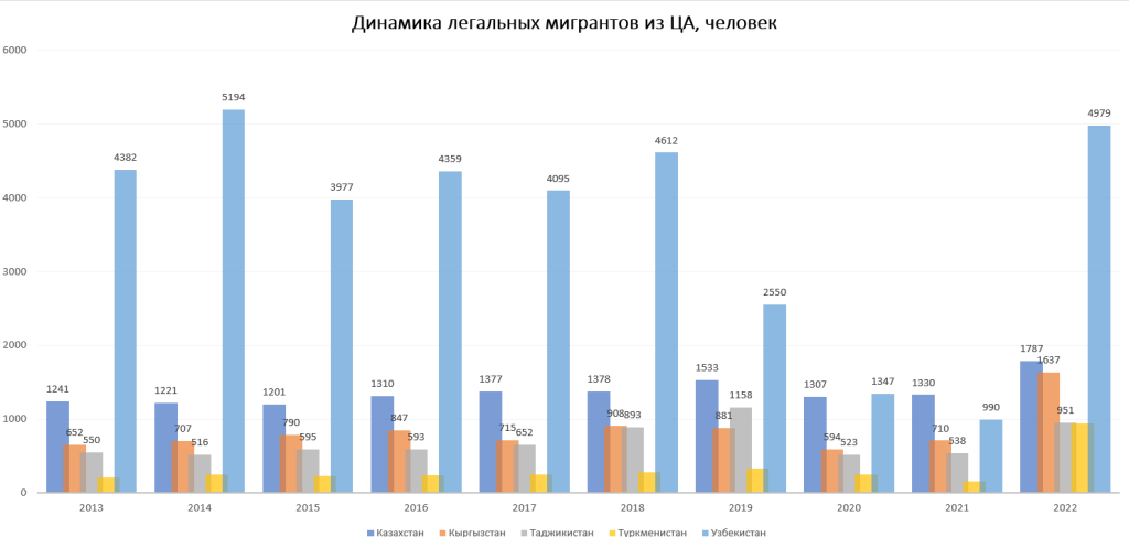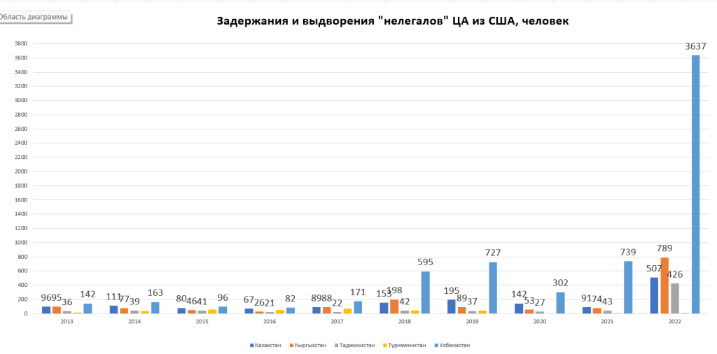 Маълумотлардан кўриниб турибдики, 2022 йилда Марказий Осиё давлатларидан қўлга олинган «ноқонуний муҳожирлар» сони кескин ошган (5367 нафар «ноқонуний»), бу республикачи сенатор Стив Дейнснинг «ноқонуний»лар сонининг кўпайиши ҳақидаги маълумотларини билвосита тасдиғи бўлиши мумкин. Марказий Осиёдан ноқонуний муҳожирлар сони.