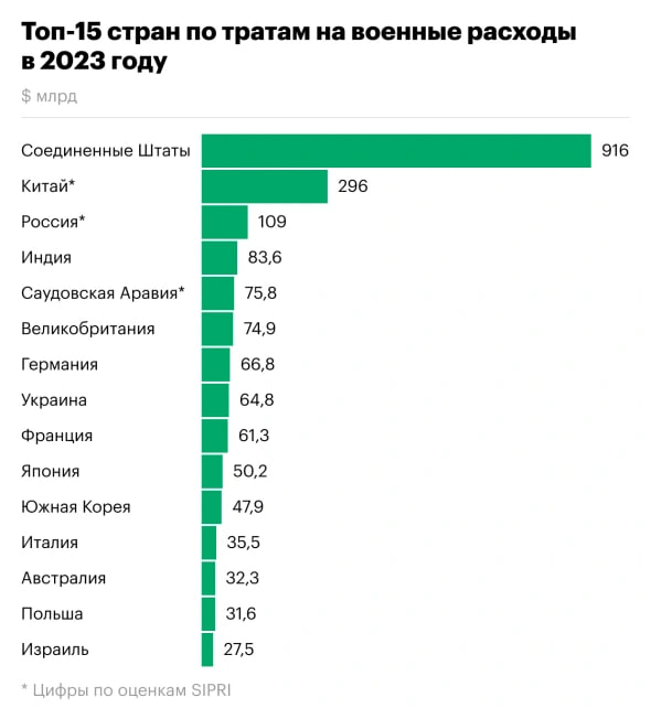 Шу билан бирга, глобал миқёсдаги харажатларнинг ярмига яқини фақат икки давлат — АҚШ (916 млрд доллар) ва Хитой (296 млрд доллар) ҳиссасига тўғри келади. Мамлакатлар ўз харажатларини мос равишда 2,3% ва 6% га оширди.