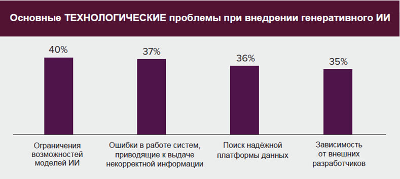 Респондентларнинг 40 фоизи таъкидлаган асосий техник муаммо – бу катта ҳажмдаги маълумотлар ва ҳисоблаш қувватини талаб қилувчи СИ моделларининг чекловлари.