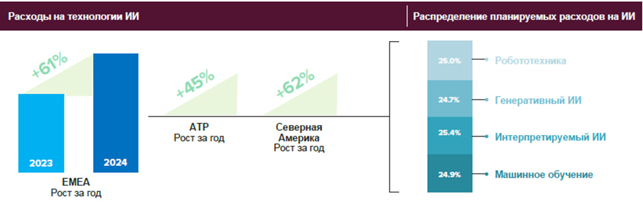 EMEA (Европа, Яқин Шарқ, Африка)да сунъий интеллектга бўлган қизиқиш турлича: Франция (58%) ва Нидерландия (56%) респондентлари СИни ўз соҳаларини ўзгартирадиган технология деб билишади; Яқин Шарқдаги респондентлар буни камроқ (30%) деб ҳисоблашади. Генератив сунъий интеллектнинг кашшоф инвесторлари орасида Италия компаниялари етакчилик қилмоқда – 68% аллақачон технологияга сармоя киритган, Даниядаги ташкилотлар эса унчалик фаол эмас – 64% шунчаки режалаштиришмоқда. Умуман олганда, EMEA минтақасида СИ харажатлари 2024 йилда Шимолий Америкадаги тенденцияларга ўхшаш (62%) ва Осиё-Тинч океани минтақасидаги технологик инвестициялар ўсишидан (АПР, 45%) сезиларли даражада юқори бўлиши кутилмоқда.