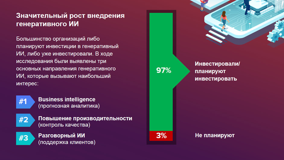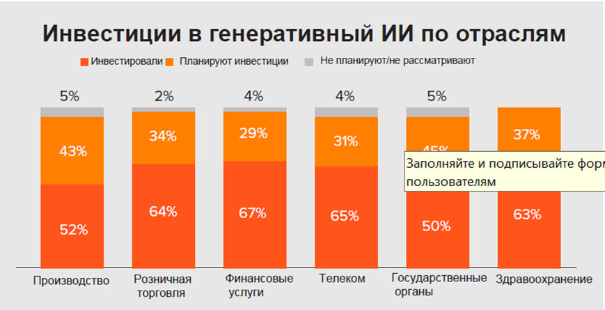 Ҳар бир соҳадаги компанияларнинг аксарияти генератив СИга сармоя киритган: ҳар иккинчи (50%) давлат ташкилоти, 65% телекоммуникация компаниялари, 67% банк, молия ва суғурта сектори. Ҳар бир вертикал СИнинг ушбу соҳасига инвестициялар ишлаб чиқариш секторида 29% ва телекоммуникация соҳасида 60% га ошган ҳолда чекка ҳисоблашнинг муҳимлигини тан олади.