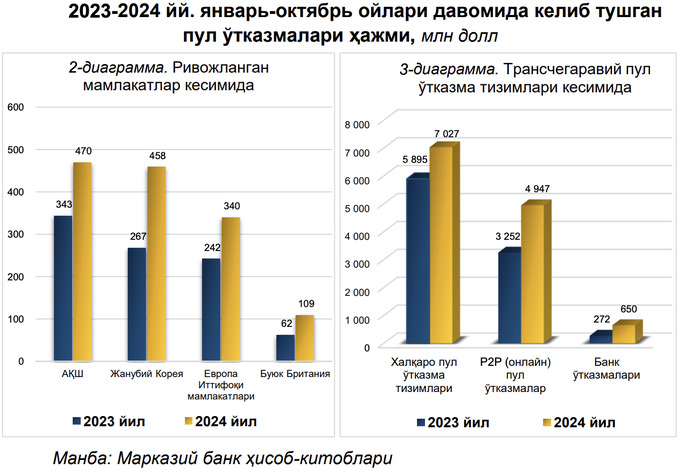 Anʼanaviy xalqaro pul oʻtkazmalari tizimlari orqali Oʻzbekistonga 7 milliard dollar kelib tushdi, bu 2023-yilning yanvar-oktyabr oylariga nisbatan 19 foizga koʻpdir. Xorijdan jismoniy shaxslarning bank kartalariga toʻgʻridan-toʻgʻri oʻtkazmalar (p2p) orqali 4,9 milliard dollar yoki 52 foizga, bank oʻtkazmalari (SWIFT) orqali esa 650 million dollar yoki oʻtgan yilga nisbatan 2,4 barobar koʻp mablagʻlar kelib tushdi.