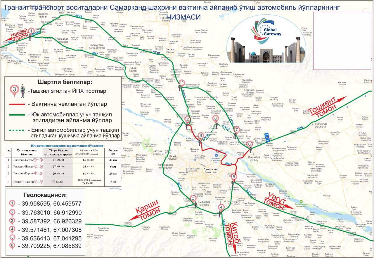 Tranzit transport vositalari uchun aylanma yoʻnalishlar tashkil etiladi. Haydovchilarga QR-kodli flayerlar tarqatiladi, ular orqali mobil ilovadan kerakli joyga qanday borishni bilib olish mumkin.